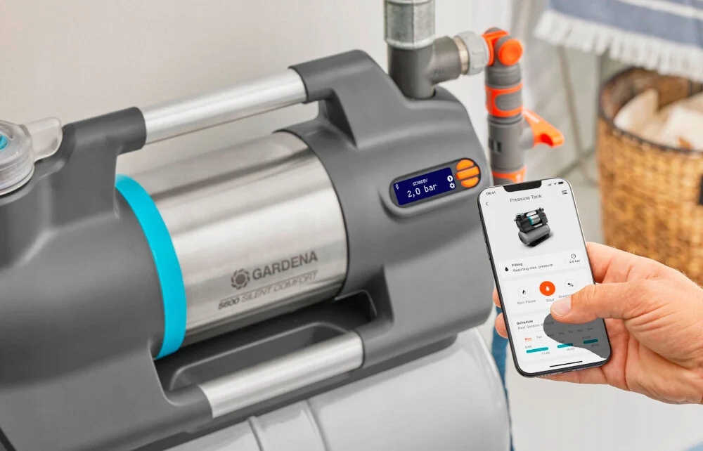 GARDENA SilentComfort Pressure Tank Set 09068-20 оснащений модулем Bluetooth , який дозволяє дистанційно керувати його роботою на відстані до 10 метрів від пристрою. Пристрій має бути налаштований за допомогою програми GARDENA App , яка дає вам можливість встановити таймер або розклад . Встановіть час поливу свого саду та насолоджуйтеся прекрасним садом, заощаджуючи час і гроші. Додаток доступний для систем Android та iOS. Підключіть водяний насос до датчика вологості ґрунту GARDENA та керуйте подачею води до ваших рослин. Це так просто, переконайтеся самі!